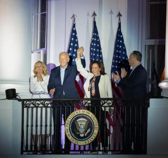 This is a photo of US President Biden (second from left) and Vice President Harris (second from right) taken at the White House in Washington, D.C. on July 4th. Photo by Hu Yousong, Xinhua News Agency reporter